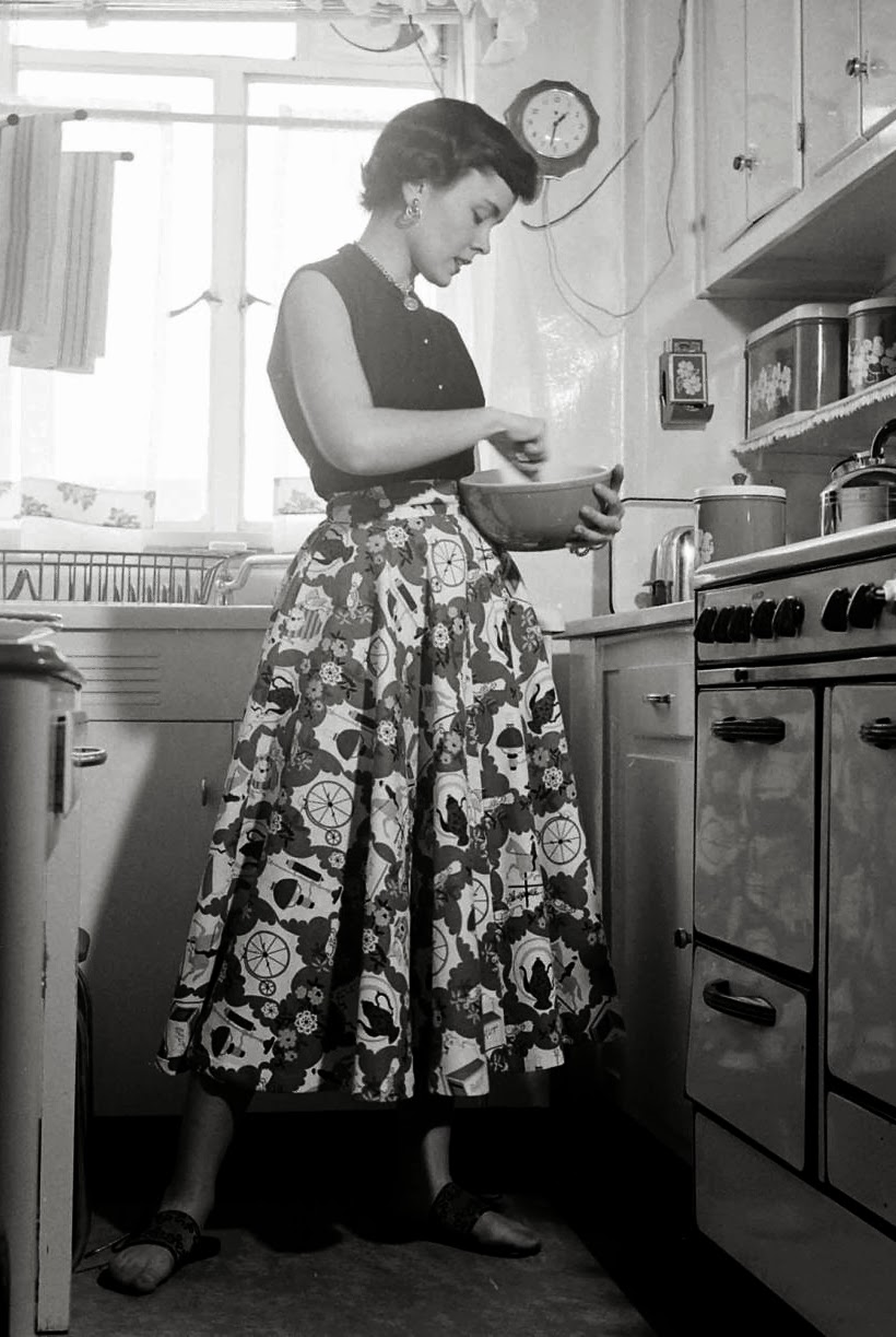 Woman cooking in kitchen wearing retro design skirt